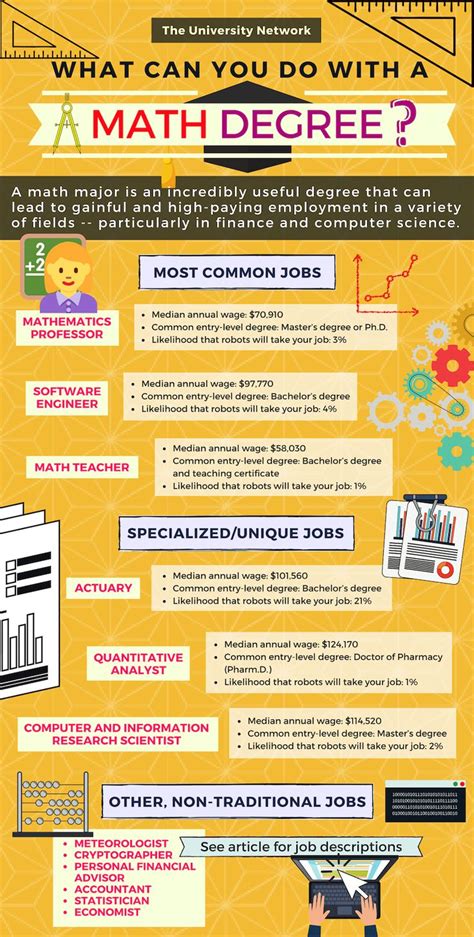 Economists are employed by a variety of institutions, including governments, universities, think tanks, corporations and private research firms, to evaluate economic issues. They spend their days conducting qualitative and quantitative research for organizations in an attempt to solve economic issues or better understand the function of the economy. Depending on their employer, an economist’s duties and role might vary. For example, an economist working in government might formulate policy proposals, while an economist working for a private corporation might help the company understand how the economy might affect its business or develop strategies that will help it perform better. Advancement in the field requires a master’s degree or a doctorate, but there are entry-level positions available for candidates with only a bachelor’s degree.Think jobs for math majors are limited in their variety? Think again. Your math skills can open the door to a huge range of amazing careers. After all, math is involved in just about every job in some way. It's particularly essential in the in-demand fields of science, technology, and engineering. If you have a solid grasp of math, jobs in many areas become more available to you.